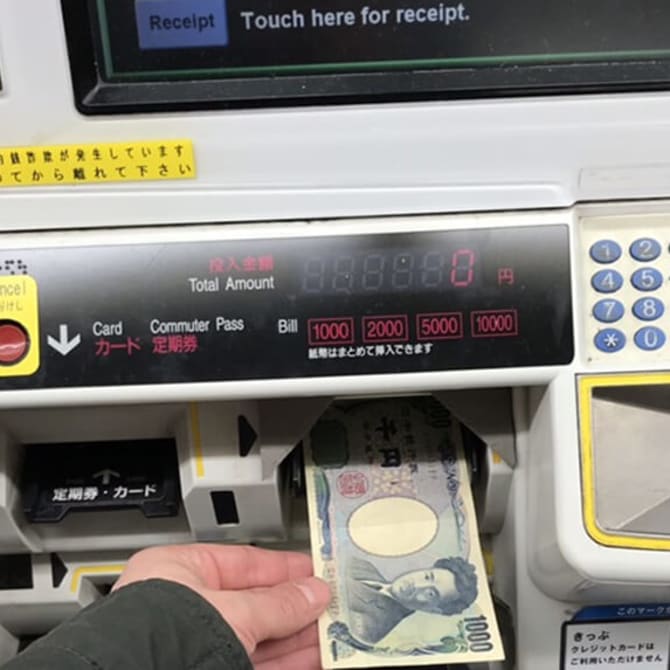 Bỏ tiền vào khe thanh toán (máy nhận cả tiền xu và tiền giấy), vé tàu tự động chạy ra ở khe nhận vé