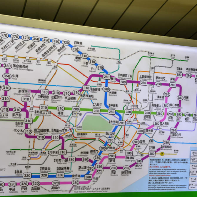 Các bản đồ tuyến tàu thường được lắp đặt bên trên khu vực máy bán vé tự động. Hành khách cần xem kỹ để mua được đúng vé tàu mình cần. Những thông tin thể hiện trên bản đồ, bằng tiếng Nhật và tiếng Anh: